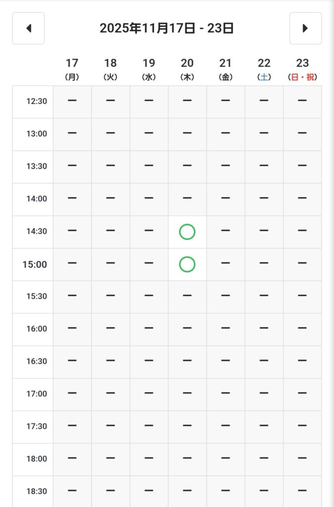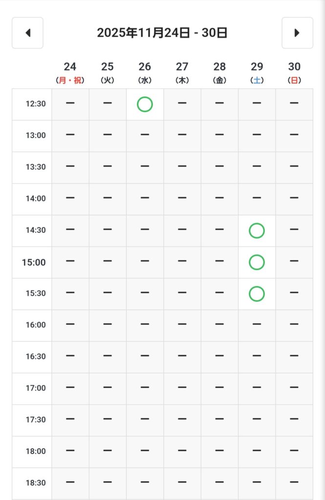 🌿(11/8更新)ご予約カレンダー 2025 11/08 お知らせ 2025年11月8日 11/8更新 11月空き状況 11/8更新 11月空き状況 🌿ご予約状況は更新時の空き情報です。詳しくはお問い合わせください。 お問い合わせ・ご予約 東京/吉祥寺セルジュ 月曜定休 吉祥寺北口より徒歩6分 【吉祥寺サンロード出口を抜けて直ぐ🌿】 お知らせ 🌿🌿ご予約についての大切なお知らせ